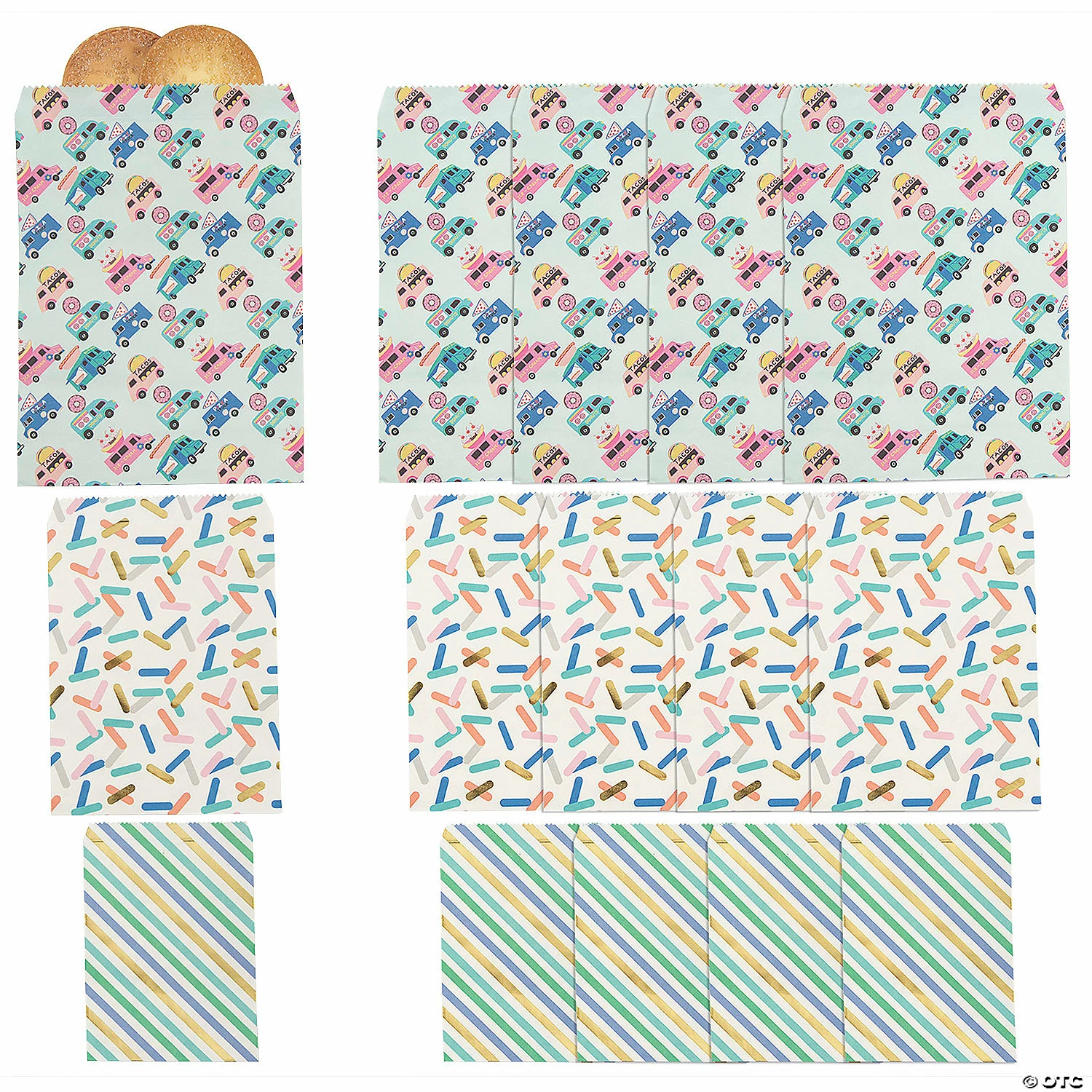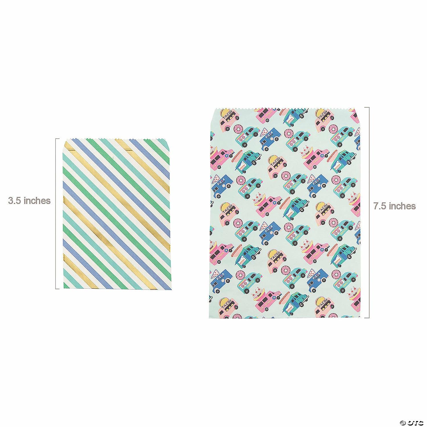 โข Travel-Friendly: Once the party is over, your guests will be happy to take home your favorite tacos, pretzels or other snacks in these easy-to-carry bags. โข Perfect Size for Parties: These treat bags are just the right size for baked goods and finger foods. Fill them up with tasty treats and hand them out as party favors at your next birthday party, holiday gathering or wedding reception!โข Say Thanks with Sweets: Are you looking for an easy way to thank the people in your life? These themed bags filled with great snacks are a sweet way to spread appreciation among party guests, students and teachers, or employees!Product Description:With three sizes of treat bags, this party supply assortment will come in handy for serving all types of food truck inspired snacks! The colorful bags are printed with food trucks, confetti and stripes and come ready to seal with taco and pretzel stickers. Pre-fill the bags with party favors before the food truck party or set them out as candy buffet bags! Includes 1 1/4″ stickers. Size: 3 1/2″ – 5 3/4″ x 4 1/2″ – 7 1/2″ Quantity: 12Material: Paper.ยฉย OTC