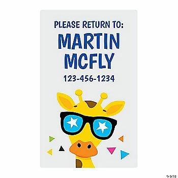These personalized stickers are fully customizable! Great for “return to” type of marking of stationery supplies or books in case they get lost, these giraffe stickers can also be used for just about anything! Add them to classroom supplies so teacher’s items can be returned to the right classroom if they lose their way. Personalize with 4 lines of text. Vinyl. (2 dozen per unit) 2″ x 3 1/4″ Β© OTC
