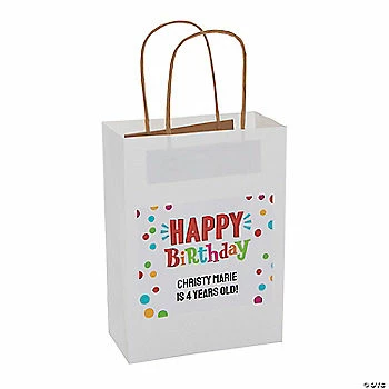 Make it a happy birthday with these personalized gift bags! Perfect as birthday party swag bags, these sturdy kraft paper bags feature a personalized sticker with a βhappy birthdayβ message along with personalized text and a fun polka dot background design. Help the birthday person feel celebrated with these fun bags. 6 1/2″ x 3 1/4″ x 9″ with 4 1/2″ handles.Β Personalize with 2 lines of text. Simple assembly required to apply personalized sticker. Β© OTC